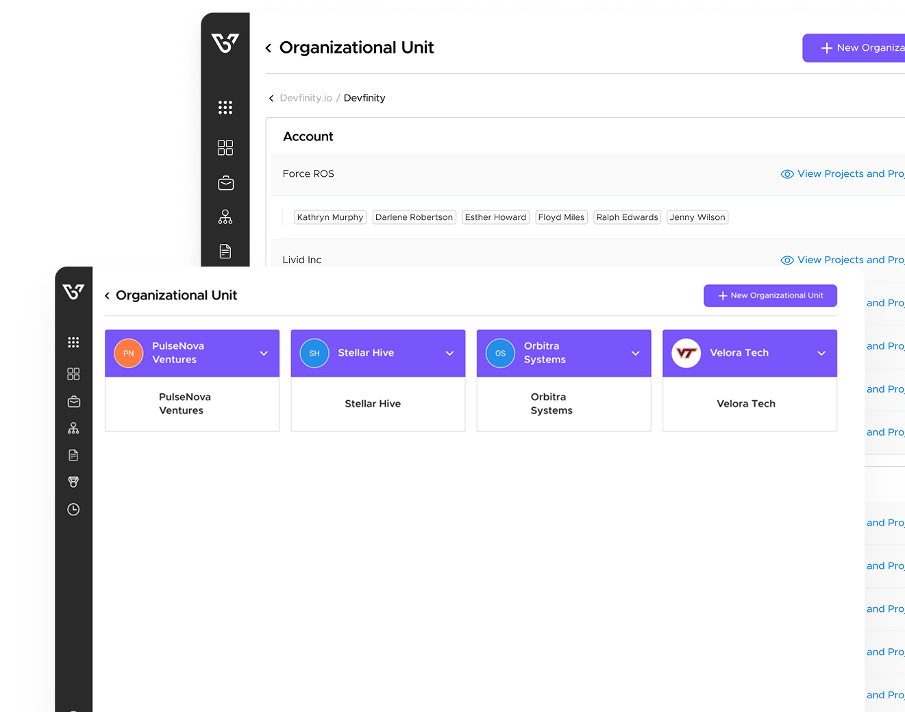 With our endlessly customizable Organizational Unit hierarchies, you can easily organize your teams in BizVue, no matter how complex your org structure. Just build your hierarchy of OUs however you need, then add internal departments and client accounts to them to start tracking and organizing your time, expenses, and projects.